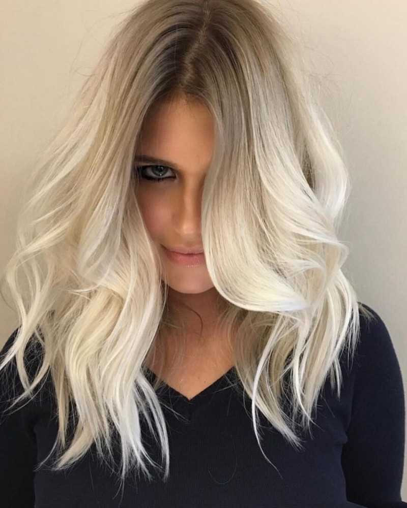 Для седых волос актуален платиновый блонд. Цвет прекрасно скрывает седину, поскольку они близки по тону. Платина пропитана благородностью и статусностью, поэтому она отлично подходит взрослым дамам.