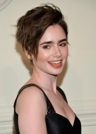 - Лили Коллинз. Считается, что с длинными локонами любая девушка более женственна. Но ведь прически на коротких волосах тоже могут иметь женственные стильные черты. Как раз так считает актриса Лили Коллинз, которая с помощью укладки «Пикси» создала романтичный образ.