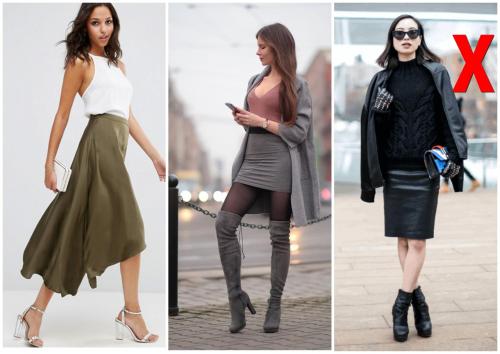 Юбки-миди не стоит надевать вместе с ботильонами. Также опасно сочетание телесных колготок и темной юбки с темной обувью. Кроме того, юбка не должна заканчивать на самом широком участке ног.