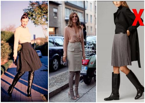 Если вы носите ботфорты или высокие сапоги под юбку, не стоит открывать ноги. Так они будут «порезаны», что украдет пару сантиметров. Лучший вариант – юбка, закрывающая край сапога в тон к нему. По этой же причине не стоит заправлять в сапоги брюки, если цвет обоих не совпадает.