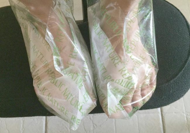 - Нанеси маску Foot Piling Mask на всю поверхность стопы – не втирай;