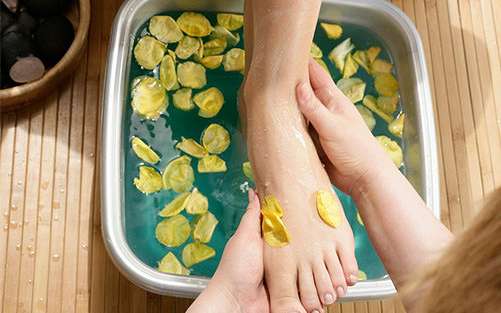 - Опустите стопы в ванночку с тёплой водой на 5-7 минут, вытрите ноги, и ещё раз обработайте их антисептиком.
