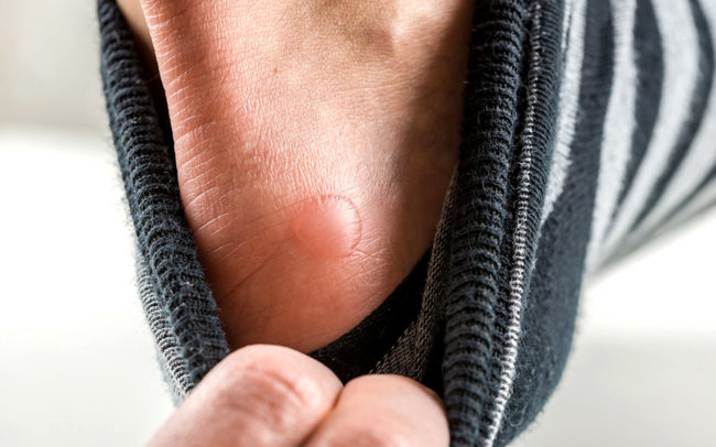Первое, что нужно сделать, это тщательно осмотреть ноги на предмет наличия микротрещин, ранок и царапин. Если видимые повреждения кожи отсутствуют, значит можно переходить к следующему этапу. В противном случае, необходимо подождать, пока ранки и трещины полностью заживут.После чего, нужно обработать стопы, пятки и пальцы ног дезинфектором или антисептическим средством.
