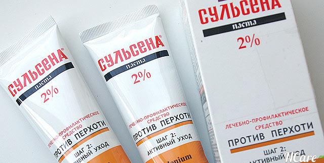 Паста сульсена 1%. Благодаря содержанию 1% сернистого соединения SeS2 (дисульфида селена) и комплексу полезных добавок паста является эффективным профилактическим средством от избыточного выделения кожного сала, появления перхоти и неприятного зуда, образования экзогенных токсинов, разрушающих корневой аппарат волос; улучшает жизнедеятельность волосяных луковиц, повышает тонус волос и предотвращает деструктивные процессы в зоне роста волосяного покрова. Способствует оздоровлению клеток кожи волосистой части головы, придает волосам здоровый вид.