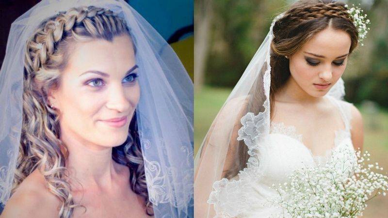 На заметку!Для отодвинутой назад фаты красиво подойдет косичка, заплетенная из коротких волос вокруг головы.