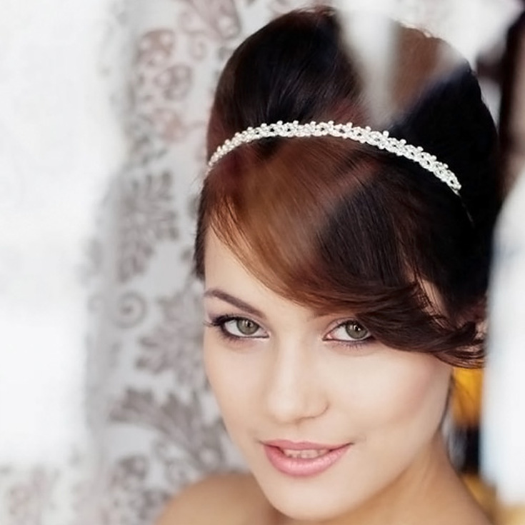 Диадема, украшенная камнями, стразами или бусинами, идеально подходит для создания образа новобрачной. Как правило, диадему размещают в том месте, где начинается челка. Она может быть любого размера и формы – очень маленькой, изящной, выполненной в виде тонкого ободка, или большой и роскошной, напоминающей настоящую корону. Еще одним весомым плюсом диадемы является ее универсальность – этот аксессуар одинаково хорошо смотрится с прямой, косой, длинной и короткой челкой. Она делает образ сказочным и позволяет невесте выглядеть по-королевски. Дополнить такую прическу нужно пышным платьем с корсетом и открытыми плечами. Если же вы предпочитаете прямые волосы, обязательно накрутите упругие локоны и сделайте на макушке небольшой начес, в который и поместите диадему. Выбрав собранную укладку, оставьте у лица несколько тонких локонов.