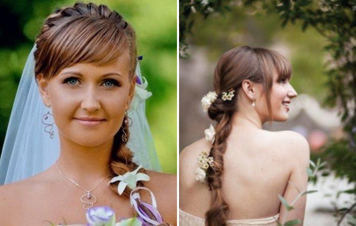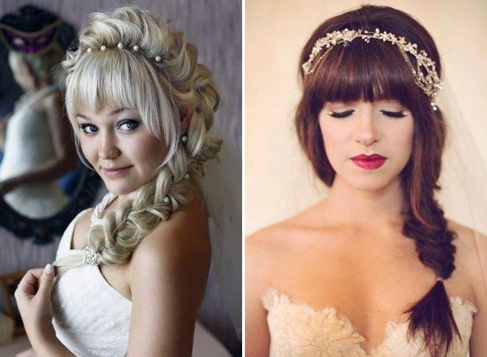 Свадебные прически с челкой – переплетения и косы