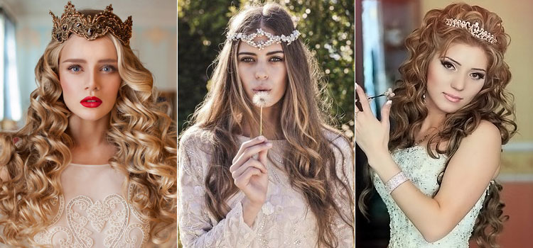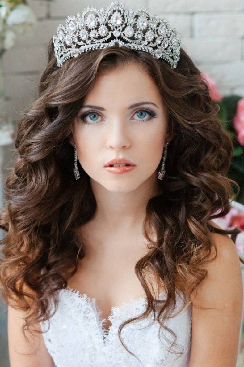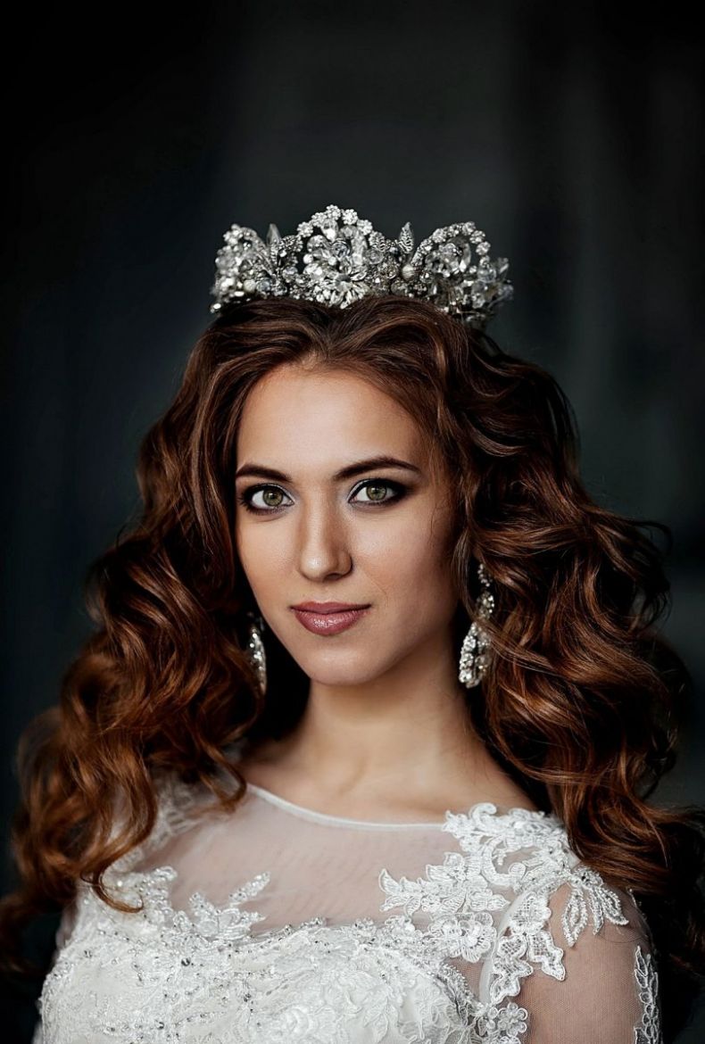 Обладательницы роскошных длинных волос довольно часто выбирают массивные тиары для украшения головы. В тренде на протяжении последних лет распущенные крупные локоны. На такую прическу тиара и фата крепятся сверху.