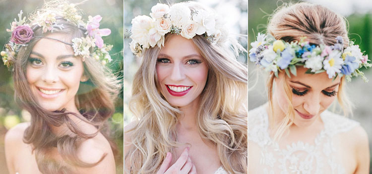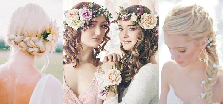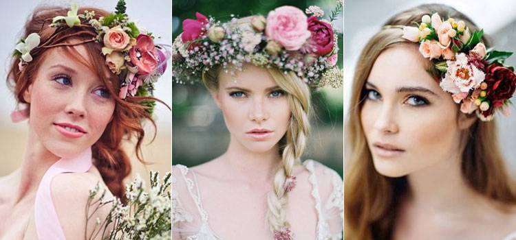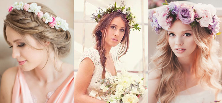 Свадебные прически в романтическом стиле или же стиле кантри можно украшать венками из живых цветов. Чаще всего они требуют распущенных накрученных волос. Венок не просто надевается на голову, но еще дополнительно крепится невидимками, чтобы он не слетел в течение дня.