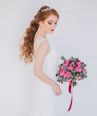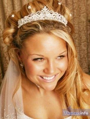 - свадебные прически с диадемой-тиарой должны гармонировать с нарядом – чем богаче и роскошнее подвенечное платье, тем шикарнее и объемнее должна быть эта вещица;