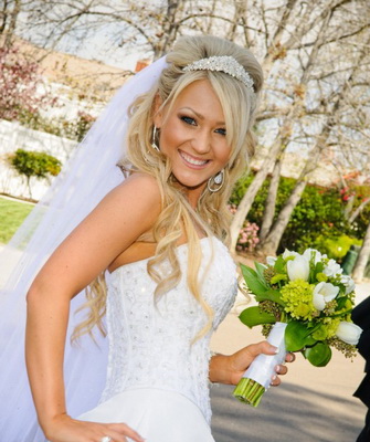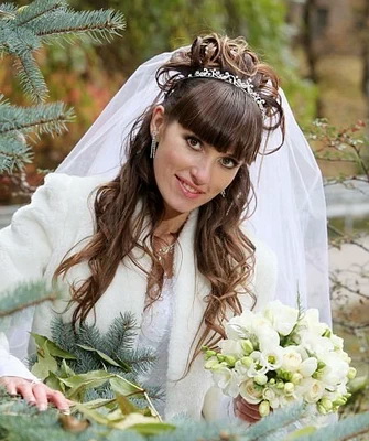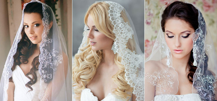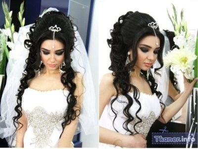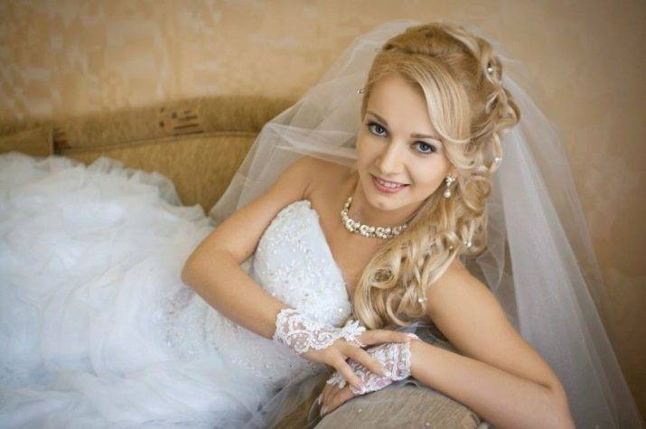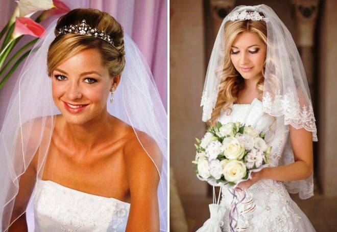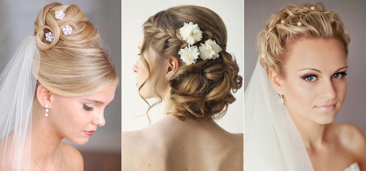 Специалистам известно около 20 вариантов завивок, но наиболее выгодно на свадьбе смотрятся классические кудри, крупные локоны и гламурная укладка в стиле Голливуда. Фата, как правило, крепится на начес, тем самым не нарушая целостности красивых локонов (начес может быть разного объема в зависимости от желаемого результата).