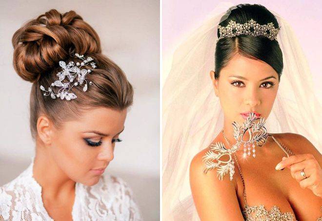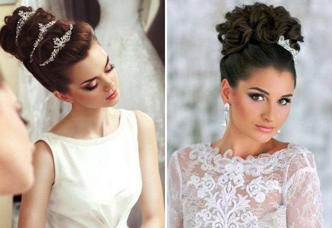 Такой вариант будет уместен не только для свадебного торжества. Фасон причёски полностью зависим от стиля, выбранного невестой. К одному из элегантных сочетаний относят классическую «бабетту» и аккуратную, прикреплённую на макушке диадему, которая ненавязчиво обрамляет пучок с начёсом.