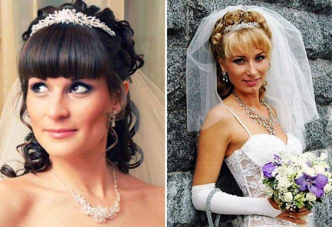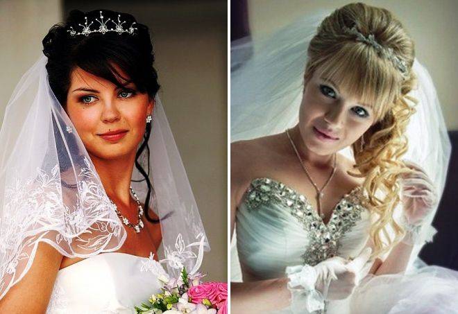 Наличие челки не является препятствием для использования данного аксессуара при создании образа молодой невесты. При этом короткая челка обыкновенно остается нетронутой, а длинная – укладывается набок. Для достижения впечатляющего результата нужно обязательно следить, чтобы за украшением шевелюра имела дополнительный объем за счет начеса или специальных инструментов, поскольку без этого она будет выглядеть неряшливо. Любые свадебные прически с челкой, фатой и диадемой должен делать профессиональный стилист, так как для их создания требуется наличие опыта.