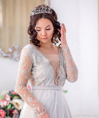 - Диадема идеально подходит для длинного наряда. Если же вы выбрали укороченное платье для свадьбы, то украшение подберите тонкое, изящное, больше похожее не на корону, а на ободок;