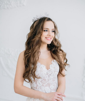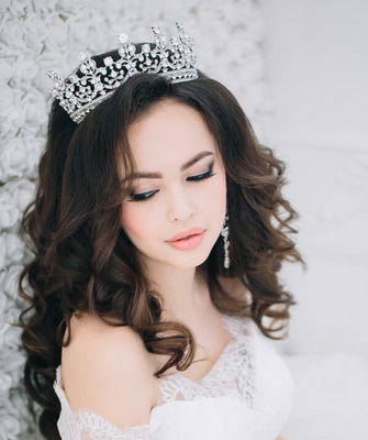 - Маленькой короной можно украсить укладку из локонов с длинной, прямой или косой челкой. Этот аксессуар пользуется огромной популярностью у совсем юных невест, выбравших для своей свадьбы образ принцессы в пышном платье.