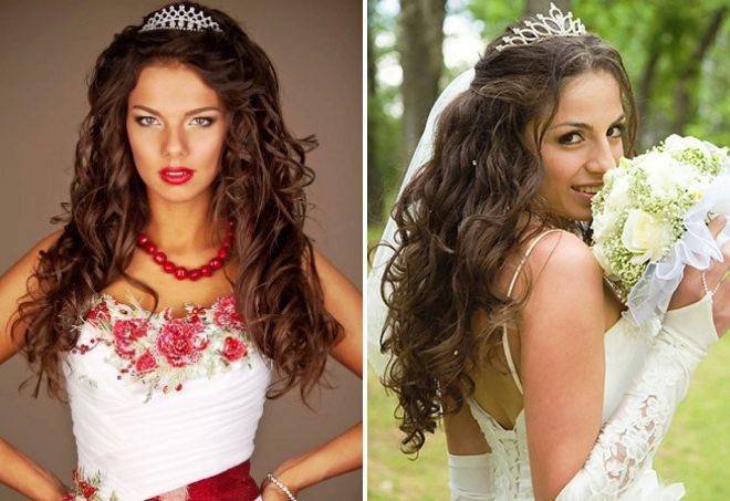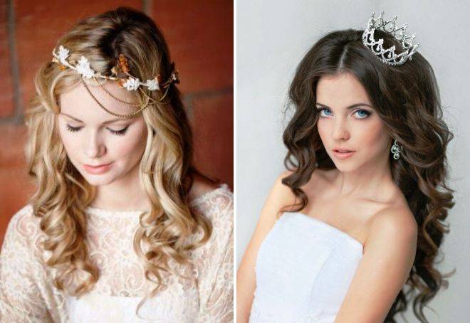 Распущенные локоны делают внешний вид своей обладательницы дорогим, изысканным и необычайно красивым. Они очень сильно нравятся женихам и лучше всего подходят для молодых и романтичных девушек. Такие свадебные прически с диадемой без фаты обыкновенно выбирают обладательницы длинных прядей, но и на шевелюре средней длины они смотрятся неплохо. Коротковолосым красавицам этот вариант недоступен, однако, они могут воспользоваться нарощенными прядями или накладкой.