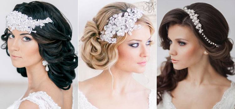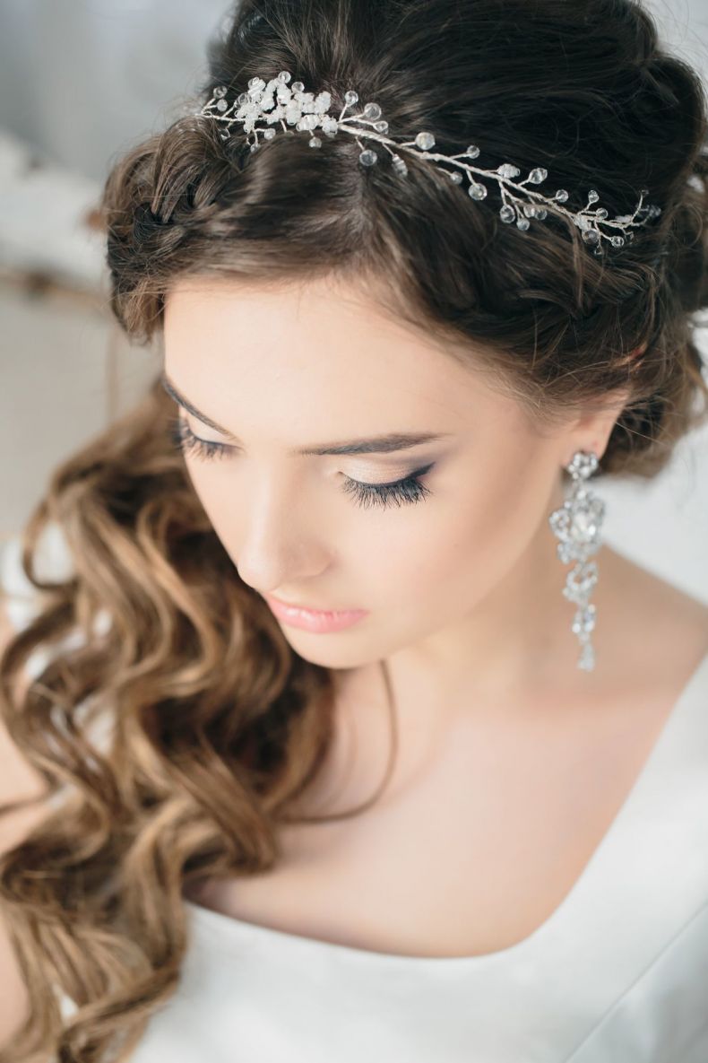 Традиционно для укладок с локонами подойдёт диадема со стразами и жемчугом. А украшения с декором в стиле минимализма отлично подойдут для причёсок, открывающих лицо.