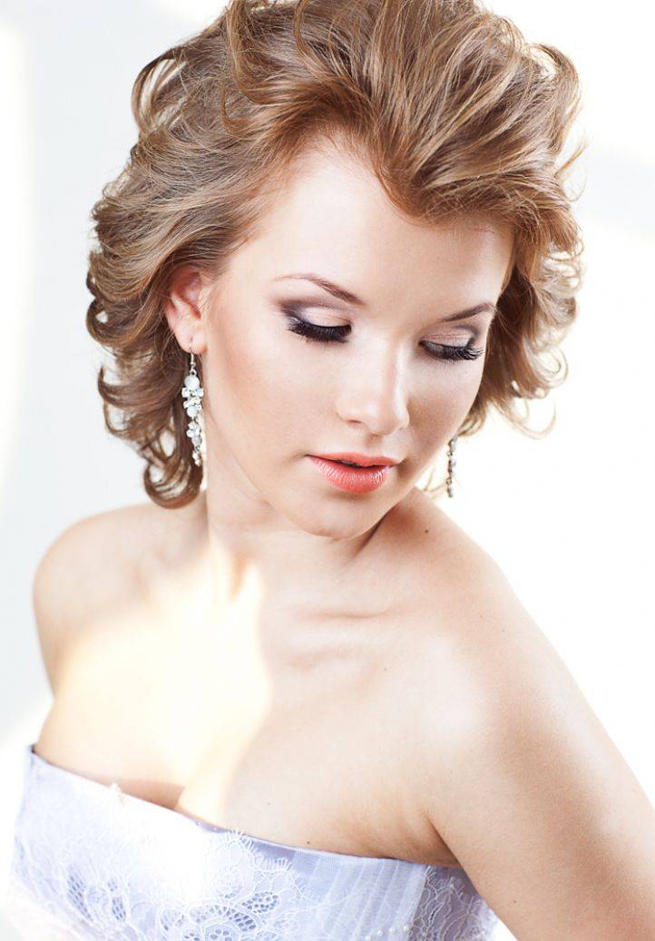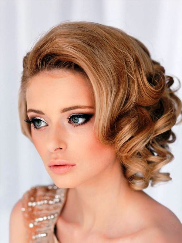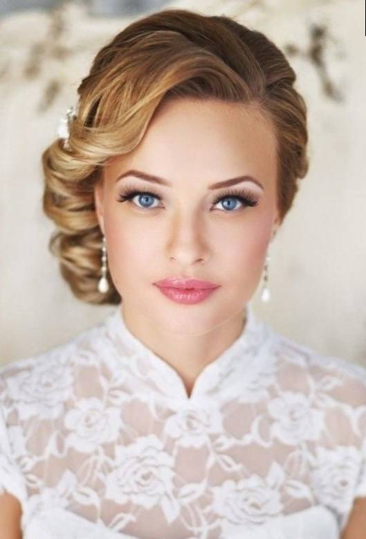Для круглого лица хорошо подходят асимметричные варианты, например, собранные, на одну сторону кудри. Такой вариант предполагает наличие аксессуаров в виде цветов или украшения с камнями.