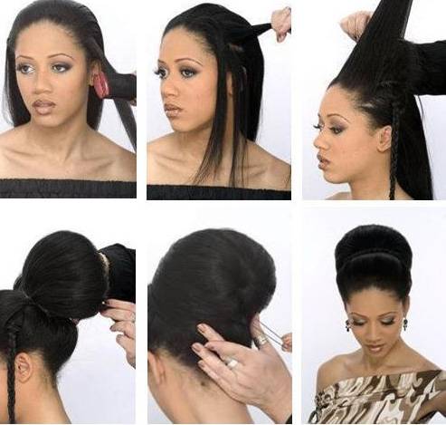 Сначала делается традиционный высокий хвост. Челку можно выпустить или, если позволяет длина, скрепить на макушке вместе с остальными прядями. На хвост надеваем поролоновый аксессуар. Обязательно его приколем в нескольких местах шпилькой.