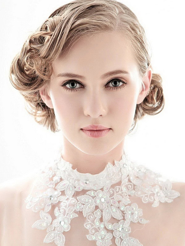 Высокий пучок делается тугим или пышным, гладким и ровным, или в форме ракушки – выбор зависит от пожелания невесты. Высокое расположение валика особенно подойдет девушкам с правильными чертами лица, а круглолицым невестам эта прическа поможет визуально скорректировать форму лица.
