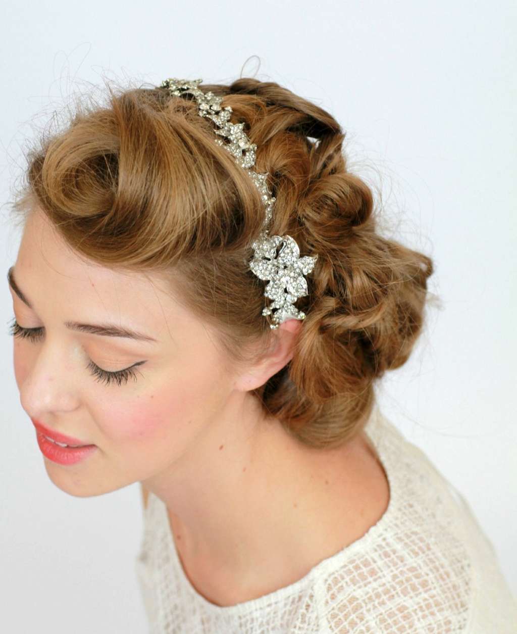 Чтобы создать классический образ, нужен тонкий обруч с камнями, стразами или настоящими цветами. К этому украшению желательно выбрать локоны или греческую прическу.