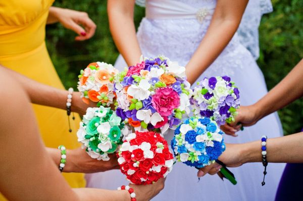 Для подружек невесты можно сделать браслеты: обычно они состоят из атласной ленты и живых или искусственных цветов, сделанных из фоамирана, полимерной глины или ткани.