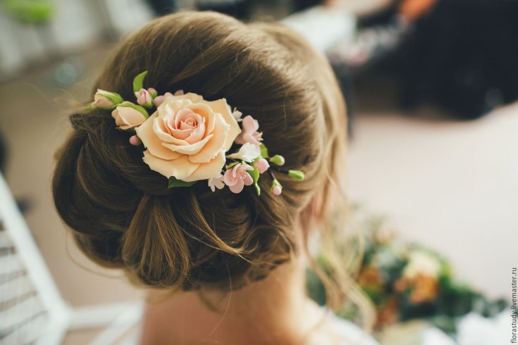 Эта заколка является более практичным вариантом, поскольку искусственные цветы сохранят свой первоначальный вид на протяжении всего праздника. Украшение для свадебной прически из фоамирана выглядит очень естественно благодаря мягкости и эластичности материала и не уступает заколкам с живыми цветами. Такие цветы могут быть украшены бусинами и стразами, что добавляет нарядности и блеска образу невесты.