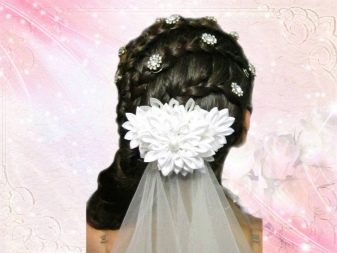 Прекрасной альтернативой ободку может стать широкая лента, расшитая бисером или стразами. Выбор такого необычного аксессуара придаст образу невесты оригинальности. Также атласные ленты широко используют для создания украшений в технике канзаши, при помощи которой можно соорудить эксклюзивное украшение с цветами.