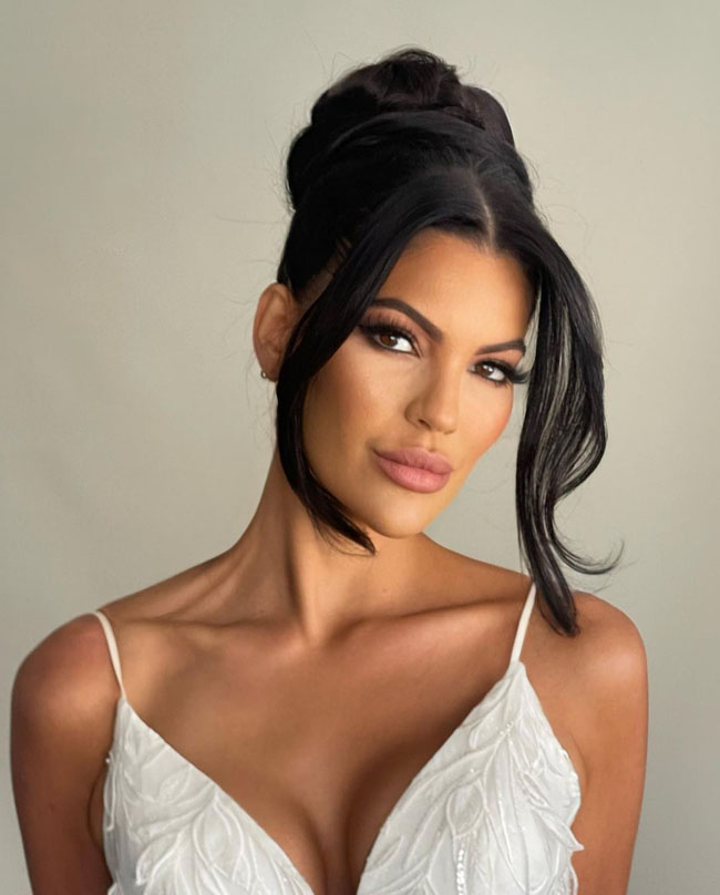 Уложенные в высокую прическу волосы: попробуйте собрать волосы в низкий пучок с несколькими распущенными прядями у лица. Они скорректируют сильную линию челюсти и ее четкие контуры.