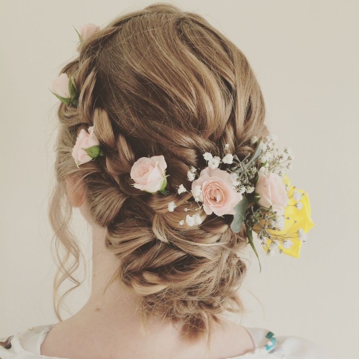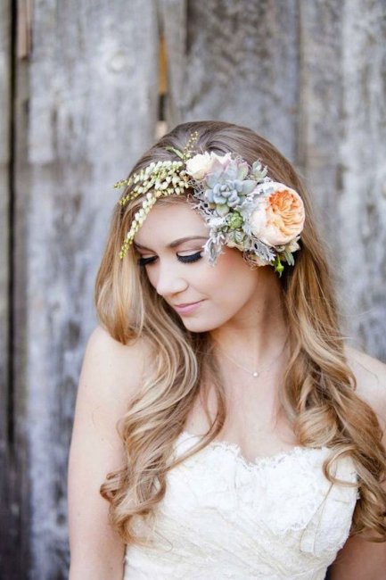 Цветы могут стать достойным украшением свадебной прически, находясь не только в венке, но и будучи прикрепленными на одежде вашим стилистом