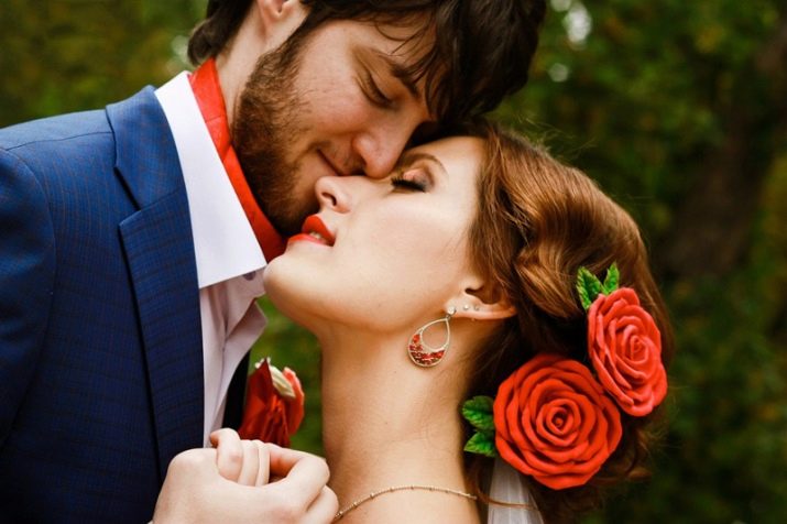 Можно создать фантазийные цветы и ажурную зелень. Восхитительно сморится комплект, состоящий из украшения в волосы, сережек и браслета. В этом же стиле создают букет для невесты и бутоньерку жениха. Главное – не переиграть с обилием оттенков и цветов.