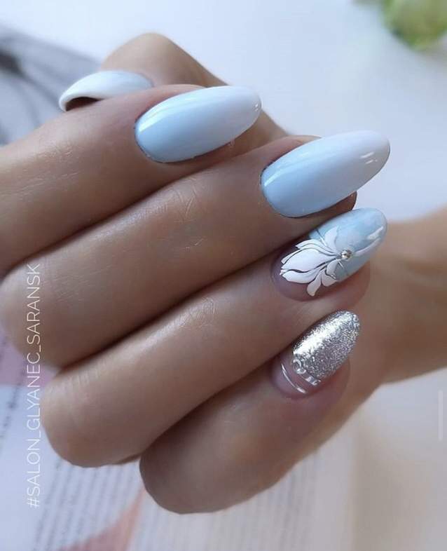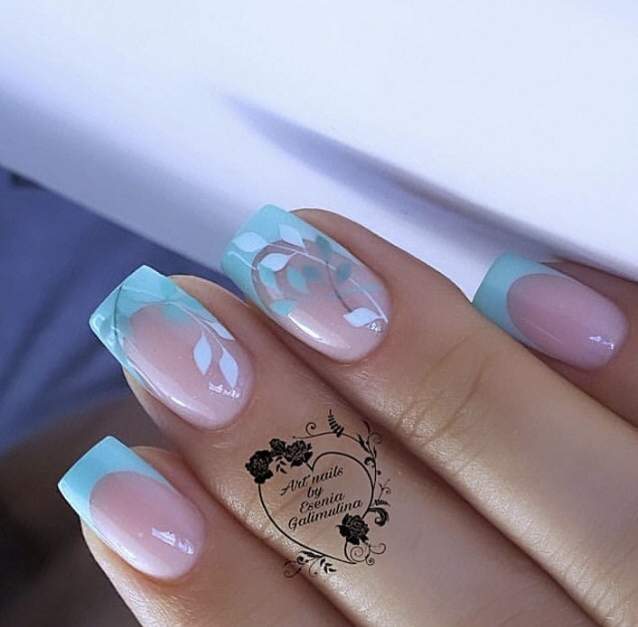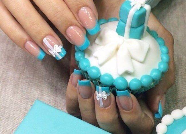 Маникюр в голубых и бирюзовых тонах прекрасно гармонирует со стразами, блестками, лепкой, френчем и бело-голубыми аккуратными рисунками.