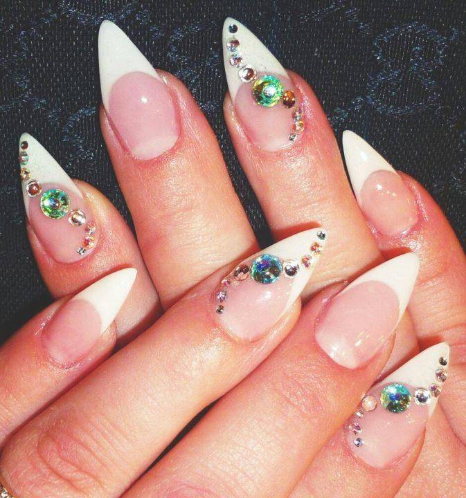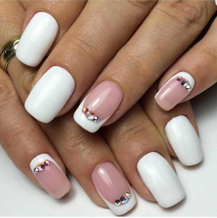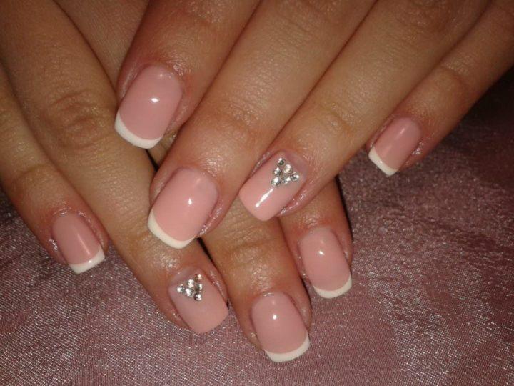 На средних и длинных ногтях с французской основой в пастельной цветовой гамме или модном стиле нюд отлично смотрятся камушки, на коротких не стоит злоупотреблять наличием блестящих декоративных деталей – лучше один-два стразика и красивая роспись.