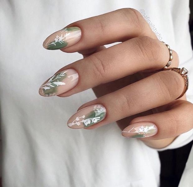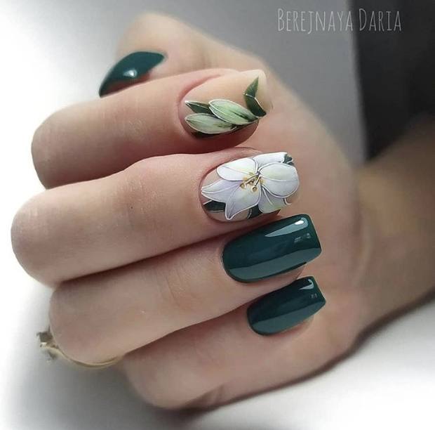 Зеленый маникюр очень стильно смотрится в сочетании с рисунками белых цветов, или с бело-серебристым дизайном одного или двух ноготков.