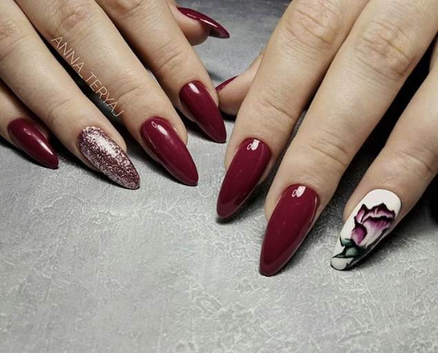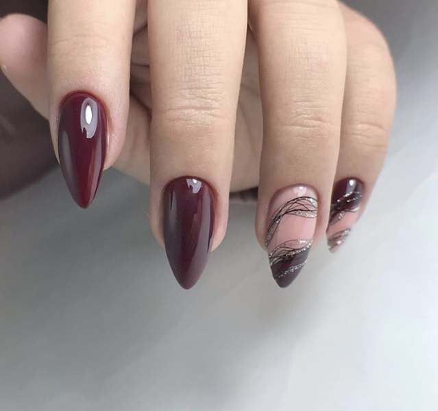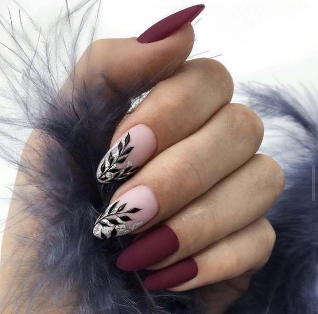Бордовый маникюр шикарно смотрится в сочетании с белым или черным дизайном.