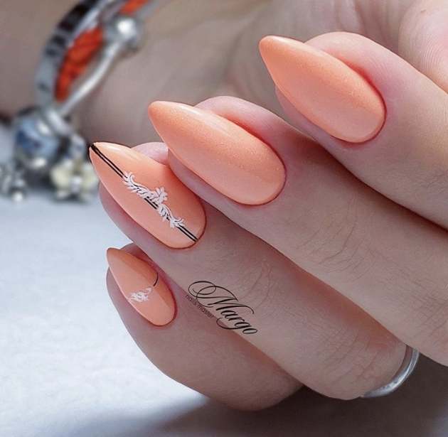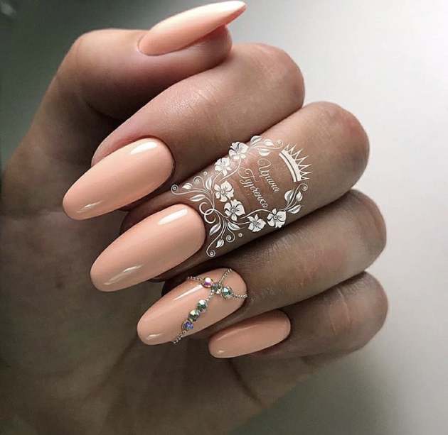 Персиковый маникюр очень красиво сочетается со стразами или нежными кружевами.
