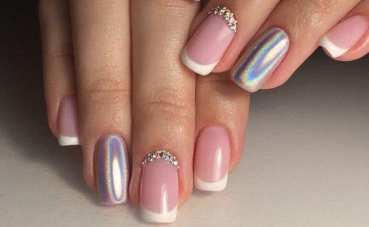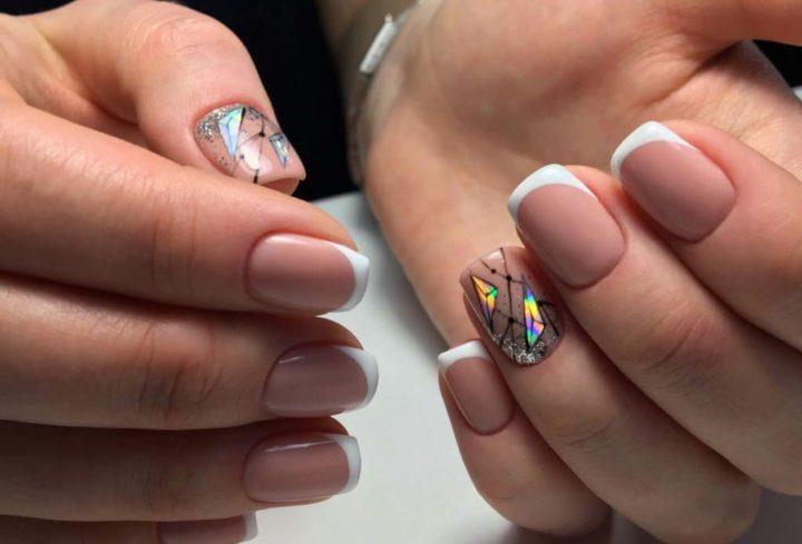 Специально для почитательниц френча, нейл-мастера решили разбавить его другими техниками, комбинируя со стразами, слюдой и иными декоративными элементами.