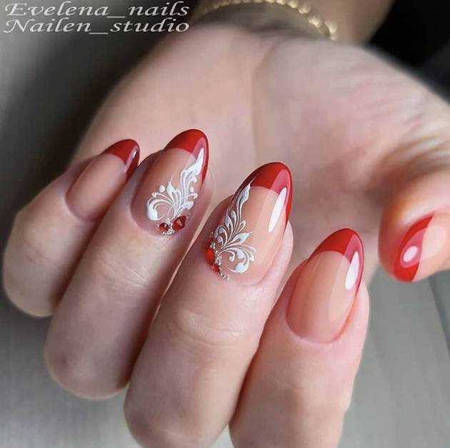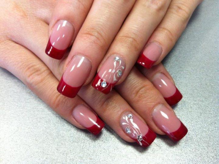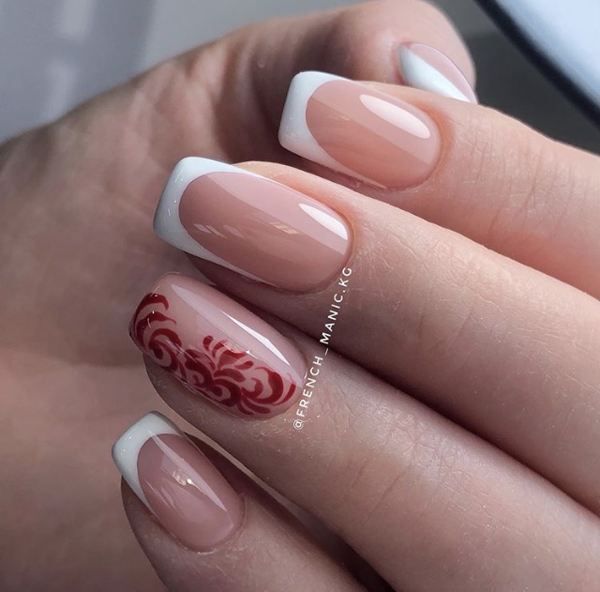 Красный маникюр может быть как в классическом однотонном варианте исполнения, так и в виде небольшого красного элемента на нюдовом или бежевом фоне. Также, очень стильно и ярко смотрится сочетание красного с белым цветом.
