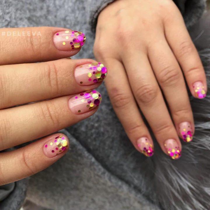 Блестящие, переливающиеся на солнце маленькие крупинки, мастера могут наносить по всем ноготкам или рисовать ими цветные узоры.
