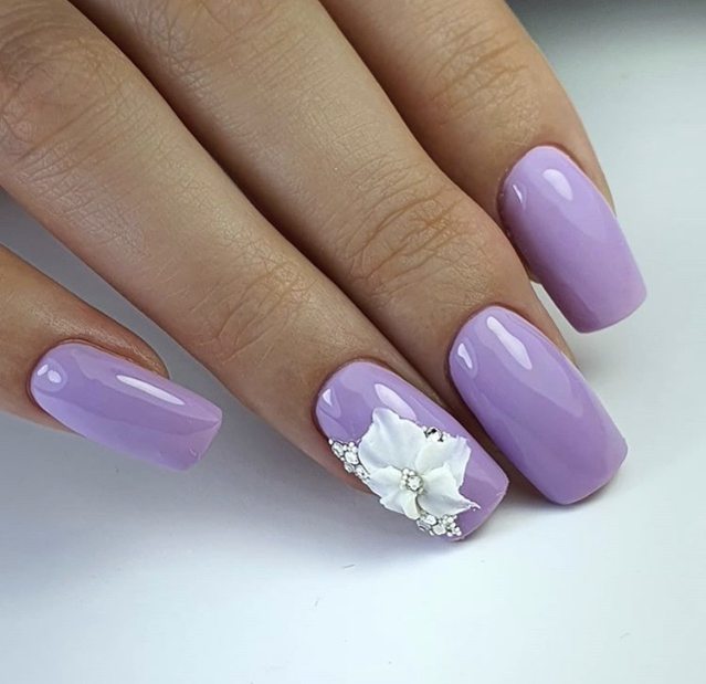 Очень нежно будет смотреться сочетание сиреневого с белым цветом. Можно украсить ноготки втиркой, золотыми украшениями или белыми аккуратными рисунками.