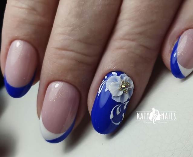 Очень красиво смотрится как классический однотонный синий маникюр, так и сочетание синего с белым цветом.