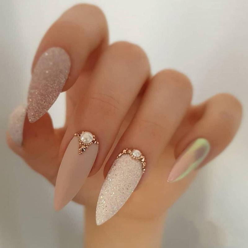 «Глиттер», фольга, камушки и стразы – всё это сверкающее разнообразие с большим успехом помещают мастера нейл-арта на пальчики невест, и в 2020 это многообразие будет вновь и вновь радовать и удивлять своей необычностью.