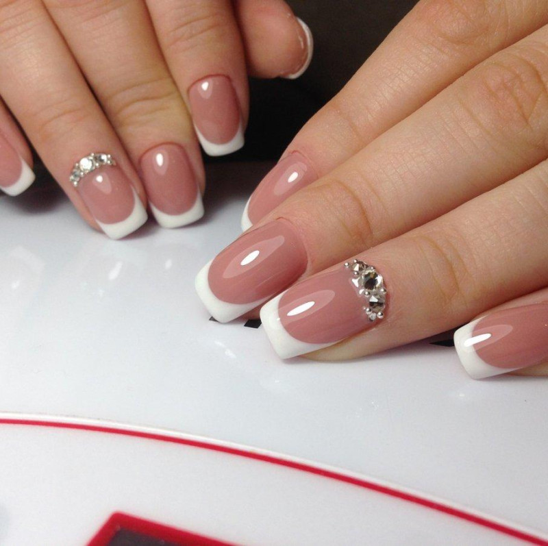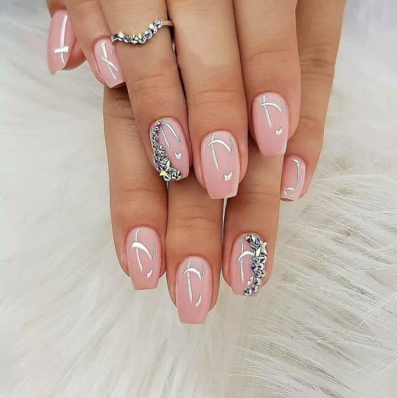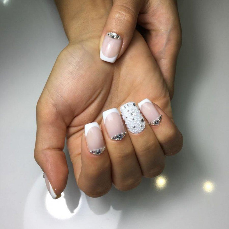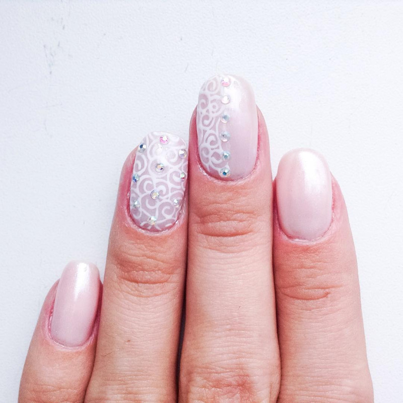 Идеальный маникюр для свадьбы должен быть выполнен в пастельных или нюдовых тонах. Но никто не запрещает использовать различные декоративные элементы, способные украсить общую картину и придать ей праздничный облик. Если для повседневного образа стразы могут показаться слишком вычурными, то в случае свадебного маникюра, они преркасно впишутся в общую картину. При желании можно разбавить такой маникюр блестками