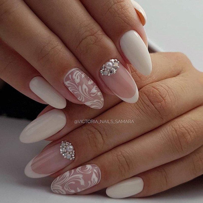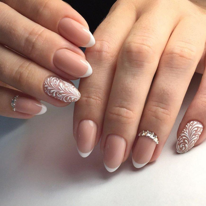 Подобный вариант свадебного маникюра выполняют в монотонном дизайне или совмещают с дизайном стразами или рисунками.