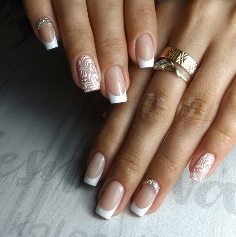 Французский маникюр — это свадебная классика. Такой дизайн давно не выходит из моды, подходит всем невестам и смотрится очень нежно — то что нужно для свадьбы. Свадебный маникюр (френч) на короткие ногти традиционно выполняется в виде белой полосы. Большая часть ногтевой пластины покрывается естественным бежевым оттенком. Дизайн можно дополнить небольшим количеством страз, блесток, различными кружевами.
