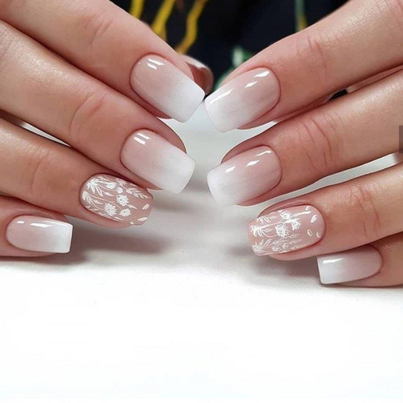 Не менее оригинально и обворожительно смотрится градиентный свадебный маникюр 2024-2025, представленный на фото примерах. Для создания подобного маникюра, совсем не обязательно использовать белый оттенок лака. Это могут быть и другие пастельные оттенки: бежевый, розовый, карамельный, сиреневый.