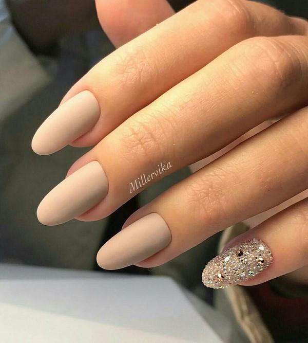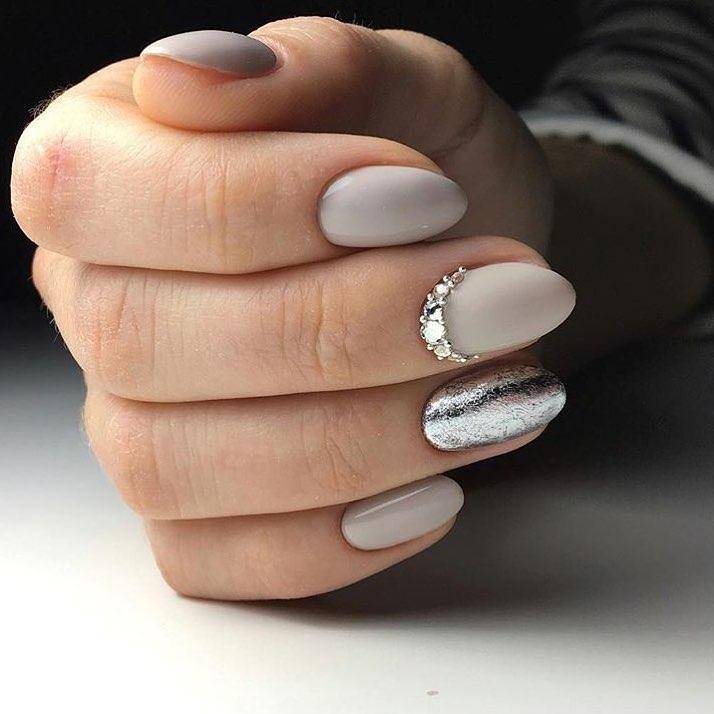 Этот маникюр выглядит стильно и сексуально. Если вы одна из тех невест, которые любят выставлять напоказ и удивлять своим внешним видом, тогда вам нужно сделать этот дизайн маникюра. Базовый цвет – серый с матовым верхним слоем. Затем добавьте немного призматического, серебряного блеска на безыменный палец.