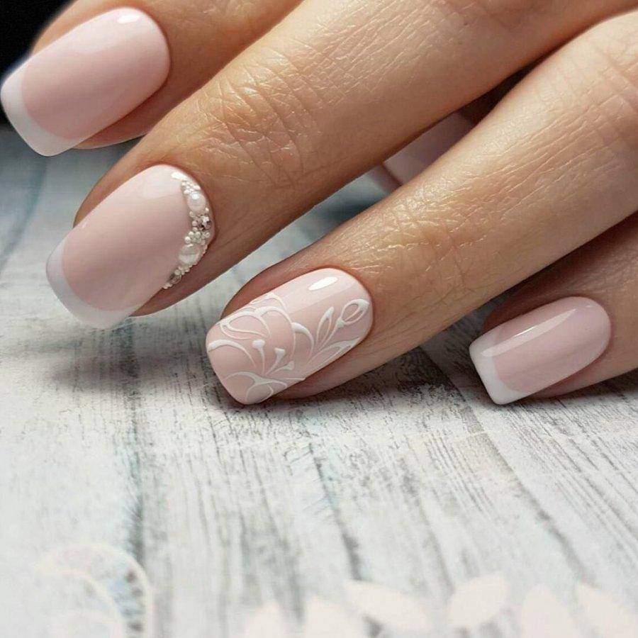Французский маникюр — это свадебная классика. Такой дизайн давно не выходит из моды, подходит всем невестам и смотрится очень нежно — то что нужно для свадьбы. Свадебный маникюр (френч) на короткие ногти традиционно выполняется в виде белой полосы. Большая часть ногтевой пластины покрывается естественным бежевым оттенком. Дизайн можно дополнить небольшим количеством страз, блесток, различными кружевами.