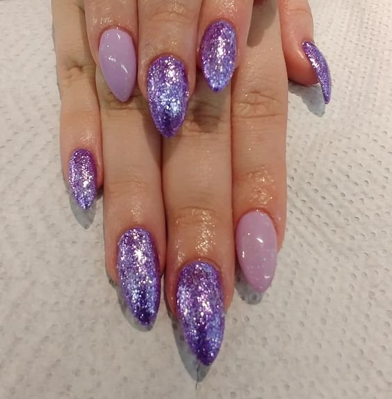 - Начиная от свободного края с рассеиванием к середине нанесите на ноготь серебряный глиттер.