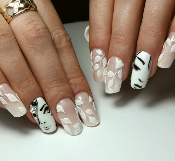 Модные рисунки с лицом девушки, ставшие очень популярными в современном нейл-арте, отлично подойдут для креативного свадебного маникюра.